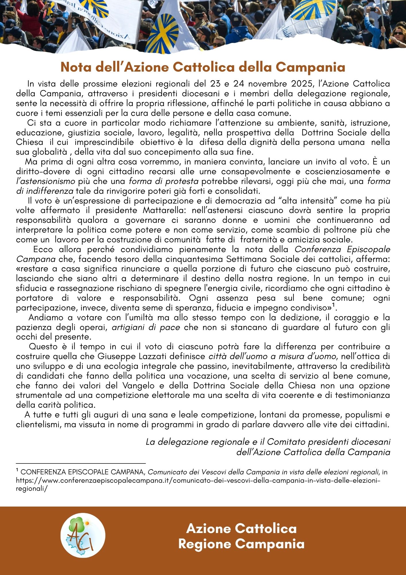 NOTA CONGIUNTA DELL' AZIONE CATTOLICA DELLA CAMPANIA 💙💛⛪😇 Condividiamo con voi un lavoro di sinergia tra la delegazione regionale di AC e tutti i Presidenti diocesani di AC della Campania. È un piccolo tassello che vuole ricordare a tutti quanto oggi andare al voto non è importante, ma essenziale e necessario 💪 Buona lettura a tutti 😊 Azione Cattolica Regione Campania #elezioniregionali2025 della #RegioneCampania